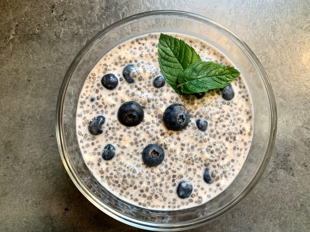 - In a bowl, combine almonds, chia seeds, almond milk, honey, oats, cinnamon and blueberries. Mix thoroughly. Cover bowl and place in refrigerator for at least 6 hours (overnight for best results). Divide into 4 portions. Place each portion into a 16 oz container with a lid for on the go. For 1 Portion: Mix ingredients directly in a 16 oz mason jar or plastic container, place the lid on, and refrigerate as above.