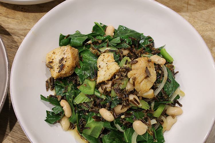 - Heat pan over medium high heat and drizzle in oil. Add onions, celery, green peppers and garlic. Saute 2-3 minutes. Add collards, beans, wild rice and fish.