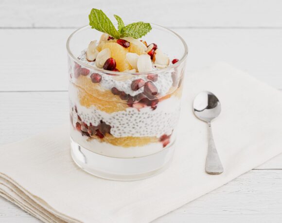 Pomegranate Orange Chia Pudding Parfait with Almonds