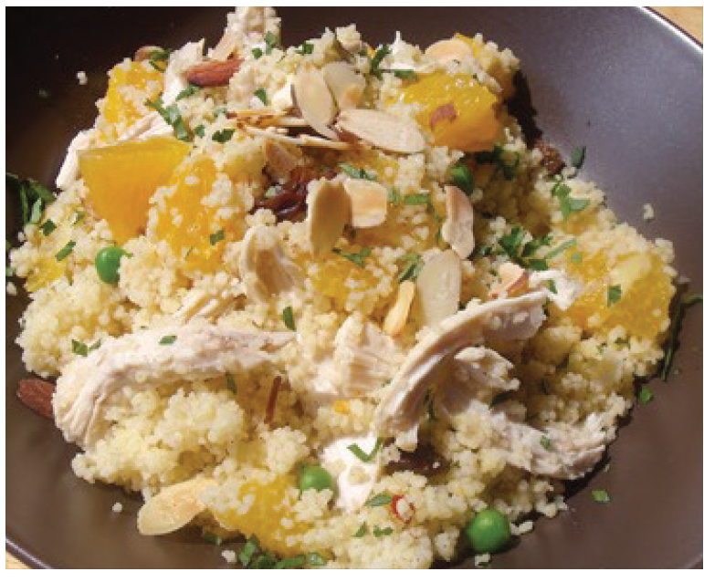 - Heat a pan over medium heat and add oil, oranges and shredded chicken until heated through. Add the cooked couscous and green peas. Toss until heated through. Garnish with toasted nuts and chopped mint.