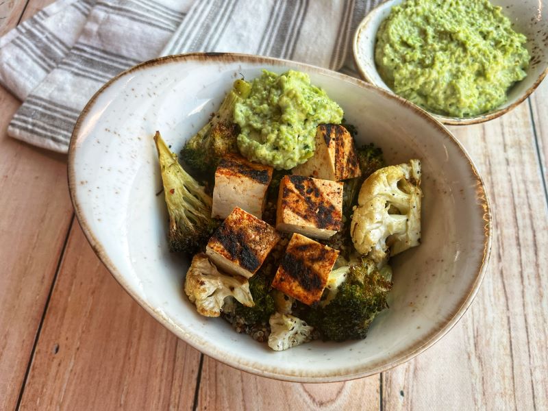 - Make veggies – Cut and trim cauliflower and broccoli into spears. Toss with oil, salt, and pepper. Place on a sheet pan and roast in 375 F degree oven until caramelized, approx 15-20 minutes.