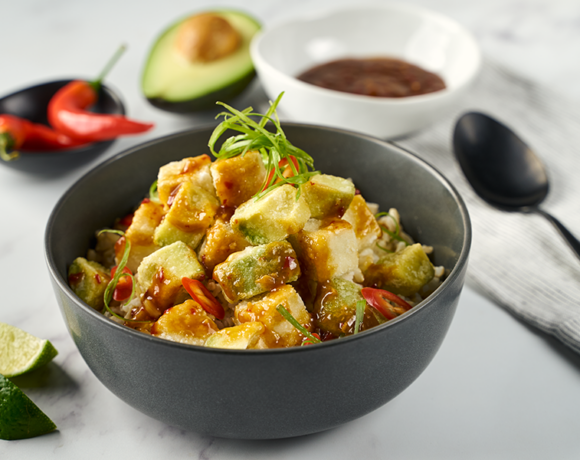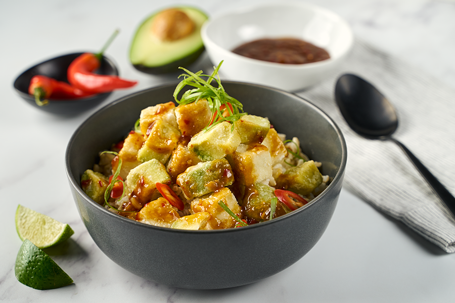 - Lightly coat tofu and avocado in cornstarch. Heat olive oil in a pan over medium-high heat. Sear off each side of the avocado and tofu until crispy, about 4-6 minutes. Coat the Tofu and avocado in warm mapo tofu sauce.