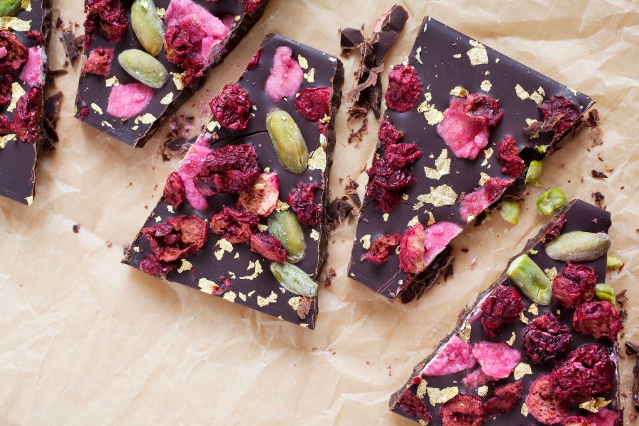 - Sprinkle with pistachio, dried cherries and sea salt. Chill in fridge until completely set, about 30 minutes.