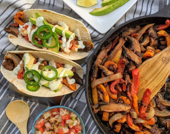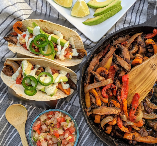 - In a large skillet, over high heat add oil. Add mushroom, red pepper and onion and all of the spices. Toss and sear vegetables quickly to get a little color and char on them – 3-4 minutes, then reduce heat and add beans and lime juice. Cook to heat through, about 2-3 minutes.