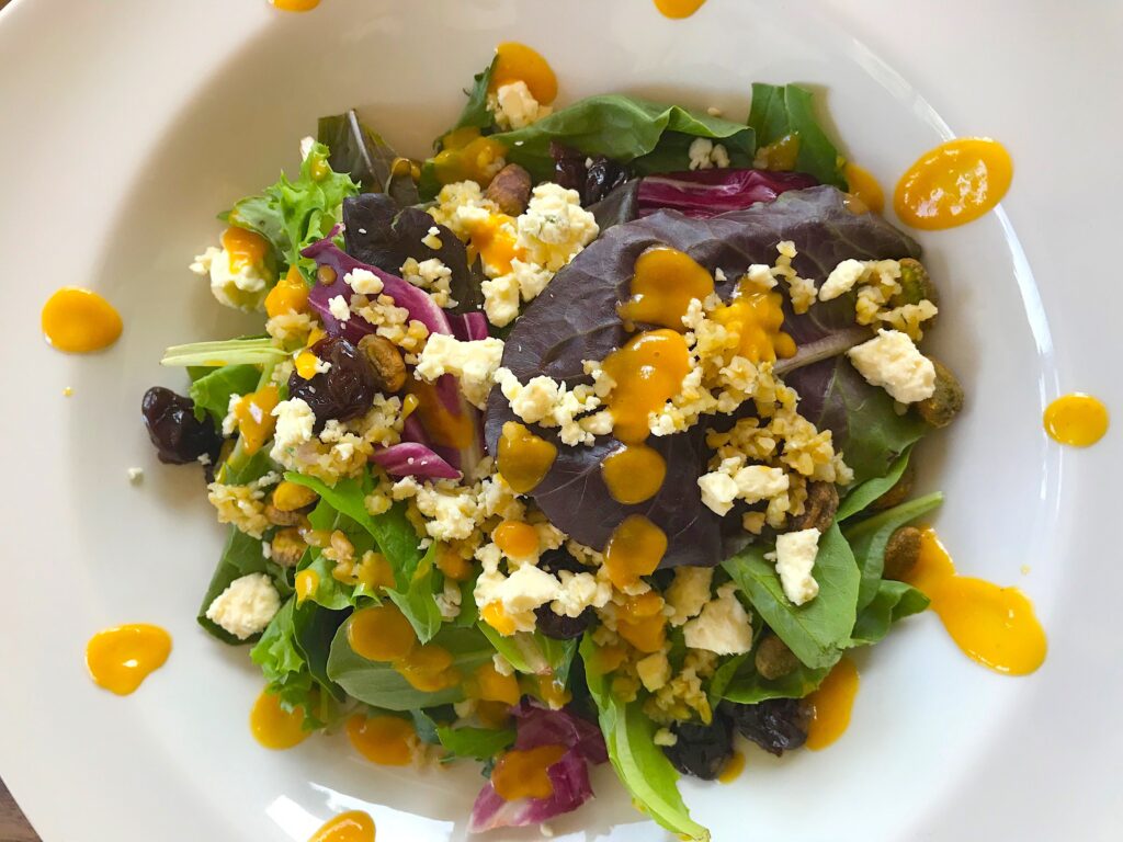 - Add greens and sprinkle blue cheese, pistachio and dried cherries on top.