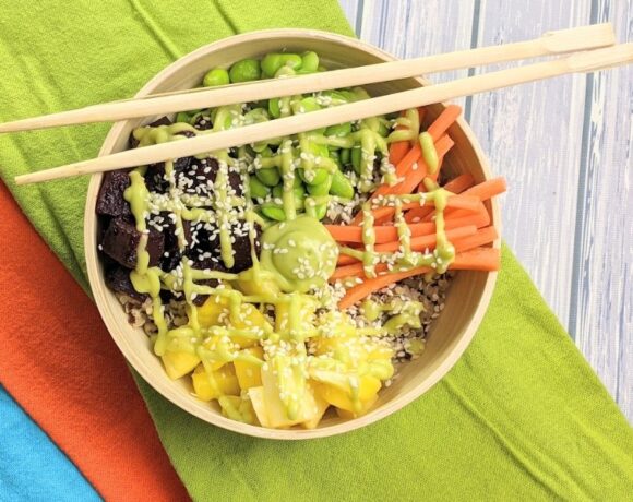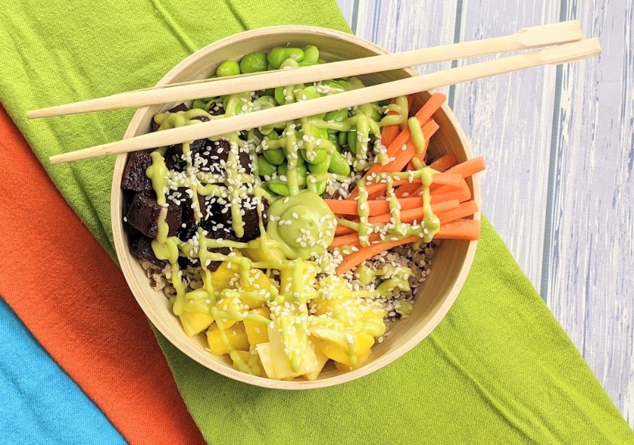 - To assemble bowls: Add 1 cup (5 ounces) quinoa to bowl. Top clockwise to show each ingredient (do not stack ingredients) with 3 ounces of beets, 1.5 ounces edamame, 0.5 ounce of carrots, 1.5 ounces of pineapple, 0.5 ounce radish. Serve with 2oz. drizzle of Hawaiian poke dressing to complete dish.