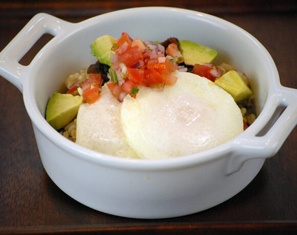 - Place rice and beans into a bowl, top with one egg each, avocado, salsa, salt, and remaining cilantro.