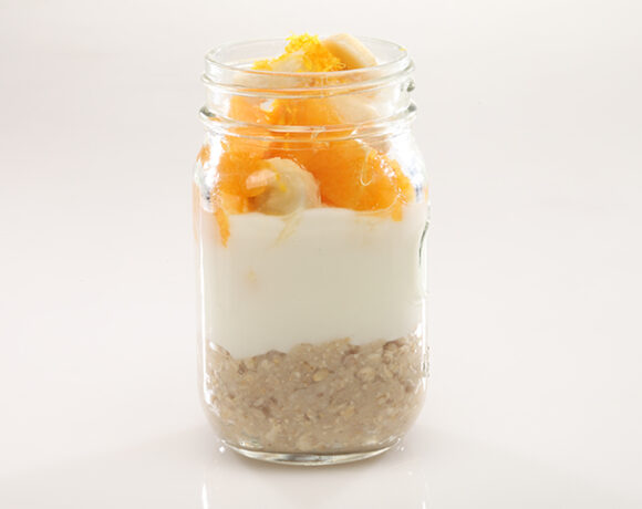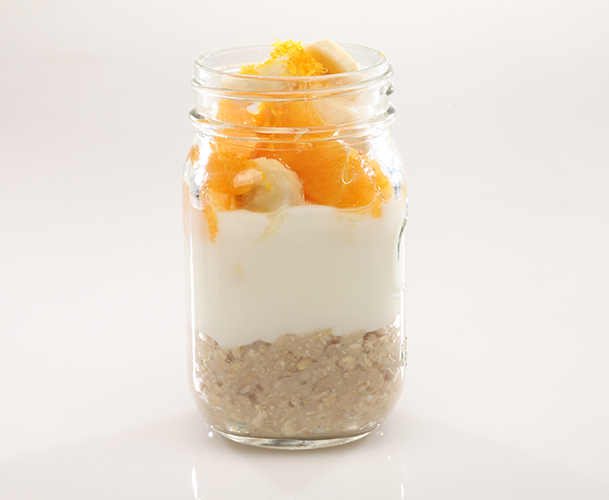 - Divide the mixture into 4 bowls or jars. Top each parfait with 2-1/2 Tbsp each of banana and diced orange and 1 tsp orange zest. Serve cold.