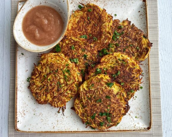 - Heat pan to medium-high heat and spray with cooking oil spray. Scoop to portion a 3 oz. latke and sear until golden brown on both sides. Finish latkes in the oven if needed at 350F, until internal temp reaches 155F.Serve with a side of applesauce.