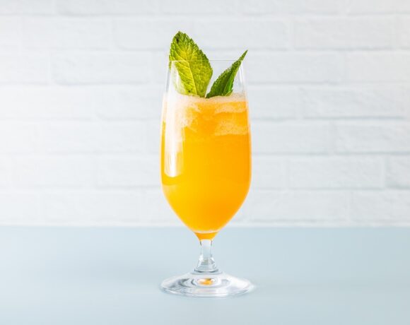 - Place 6 floz of peach puree mixture in a glass. Top with 3 floz sparkling water. Garnish with a sprig of mint.