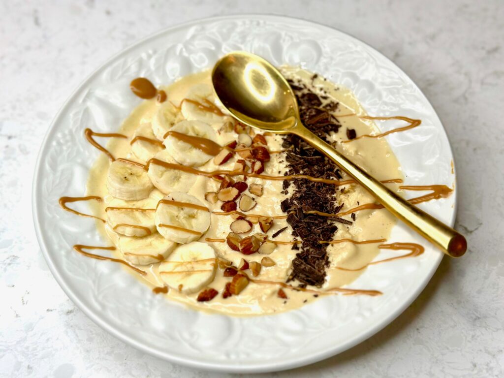 Peanut butter and banana smoothie bowl with almonds and cacao nibs