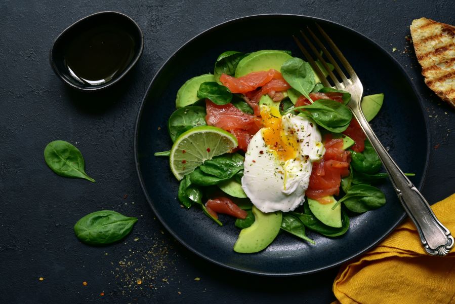 - Divide the greens between four plates. Top with spoonful’s of the guacamole dropped randomly on top of the salad. Cut the egg in half and place in the center. Sprinkle with a small pinch of salt.
