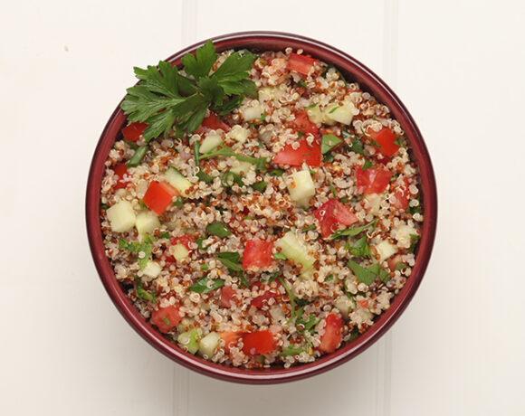 - Place quinoa in a pot with water and bring to a boil; lower heat to simmer and cook until tender and outer ring is visible, about 15 – 20 minutes. Drain and chill.