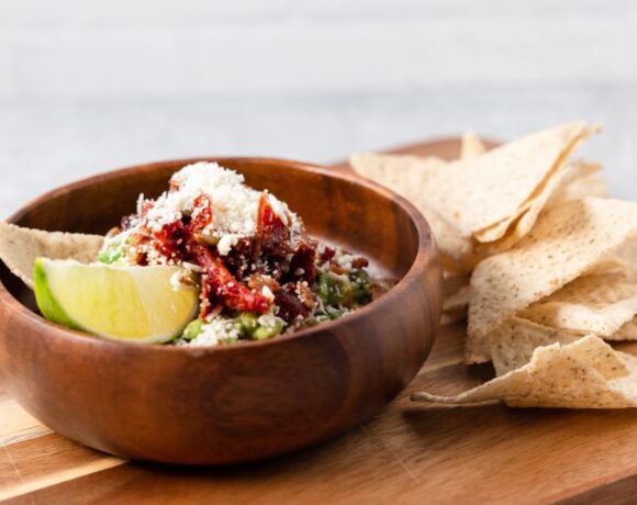 Take your guacamole to the next level with this bold, flavor-packed twist — creamy avocado meets smoky bacon, crunchy pepitas, tangy sun-dried tomatoes, and a generous sprinkle of crumbled cotija cheese for the ultimate blend of texture and taste.