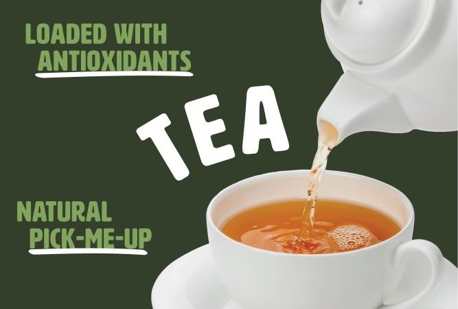 - Tea contains the polyphenol theanine which affects certain neurotransmitters in the brain to produce a calm state of mind. Polyphenols are antioxidants that have been studied and show promise in the reducing the risk of certain cancers.