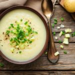 Clean asparagus and remove tips. Blanch and shock the tips. Set aside. Sauté onions and leeks in butter in soup pot until translucent. Dust with flour to make roux, stir.Add stock, potatoes, asparagus stems, bay leaf, black pepper and salt. Bring to a boil, reduce heat. Simmer for 1 hour.Remove bay leaf, puree and strain. Garnish with blanched asparagus tips and serve.