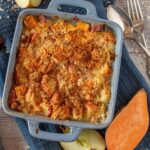 Preheat oven to 350F degrees. Peel and slice sweet potatoes and apples and place in bowl. Set aside until ready for use.