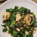 blackened cod served with sauteed wild rice with celery, green bells, collard greens and cannellini beans