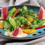 Crusted Seared Tuna with oranges, grapefruit, capers, fennel, and pumpkin seeds on a bed of arugula