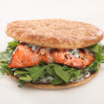 grilled salmon, fresh baby arugula, and lemon caper mayonnaise on a whole wheat sandwich thin