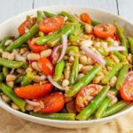 Cut onions, tomatoes and drain beans and add to a bowl with green beans, salt and dressing and toss to combine.