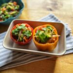 Cut off the tops of the peppers and remove the membrane. Use tops for another application. Prepare a sheet tray with pan spray. Fill each pepper with 3/4 cup of tempeh filling. Bake in a 350F degree oven until heated through and peppers are softened, about 15 minutes. Remove from oven, top each stuffed pepper with about 2 tbsp. of avocado salad.