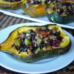Heat olive oil in a hot pan and sauté onions, celery and garlic until tender. Remove from pan and place in a large bowl; add the remaining ingredients: fresh thyme, dried cranberries, remaining salt, black pepper, olive oil, balsamic vinegar, as well as the cooked wild rice. Mix to incorporate. Stuff into cooked acorn squash (each will hold about 1/2 cup of stuffing).