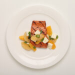 Drizzle olive oil on the salmon and season with salt and pepper. Place salmon on a pre-heated grill and cook for approximately 3 to 4 minutes on each side. Place in the oven for 5 minutes until firm but not dried out.