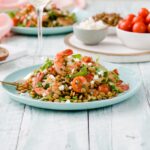 Seared shrimp with lentils tossed with lemon, tomatoes and topped with feta cheese.
