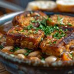 Braised tempeh and white beans with mushrooms, herbs, and spinach
