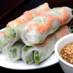 Soak the rice paper in warm water for about 15 seconds, until it starts to soften and then place it on a cutting board. Place about a half cup of the vegetable filling in the center of the wrapper and top it with the basil, cilantro, mint, avocado and two shrimp pieces.